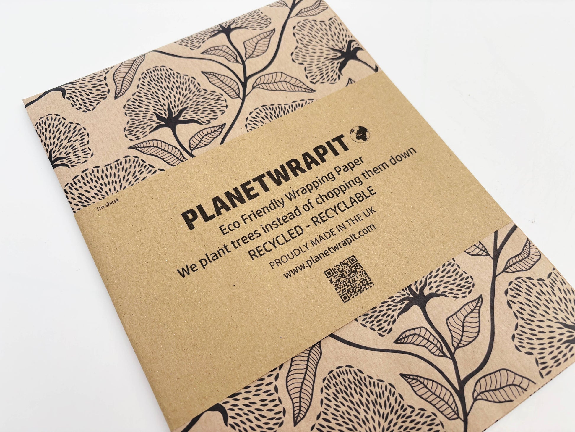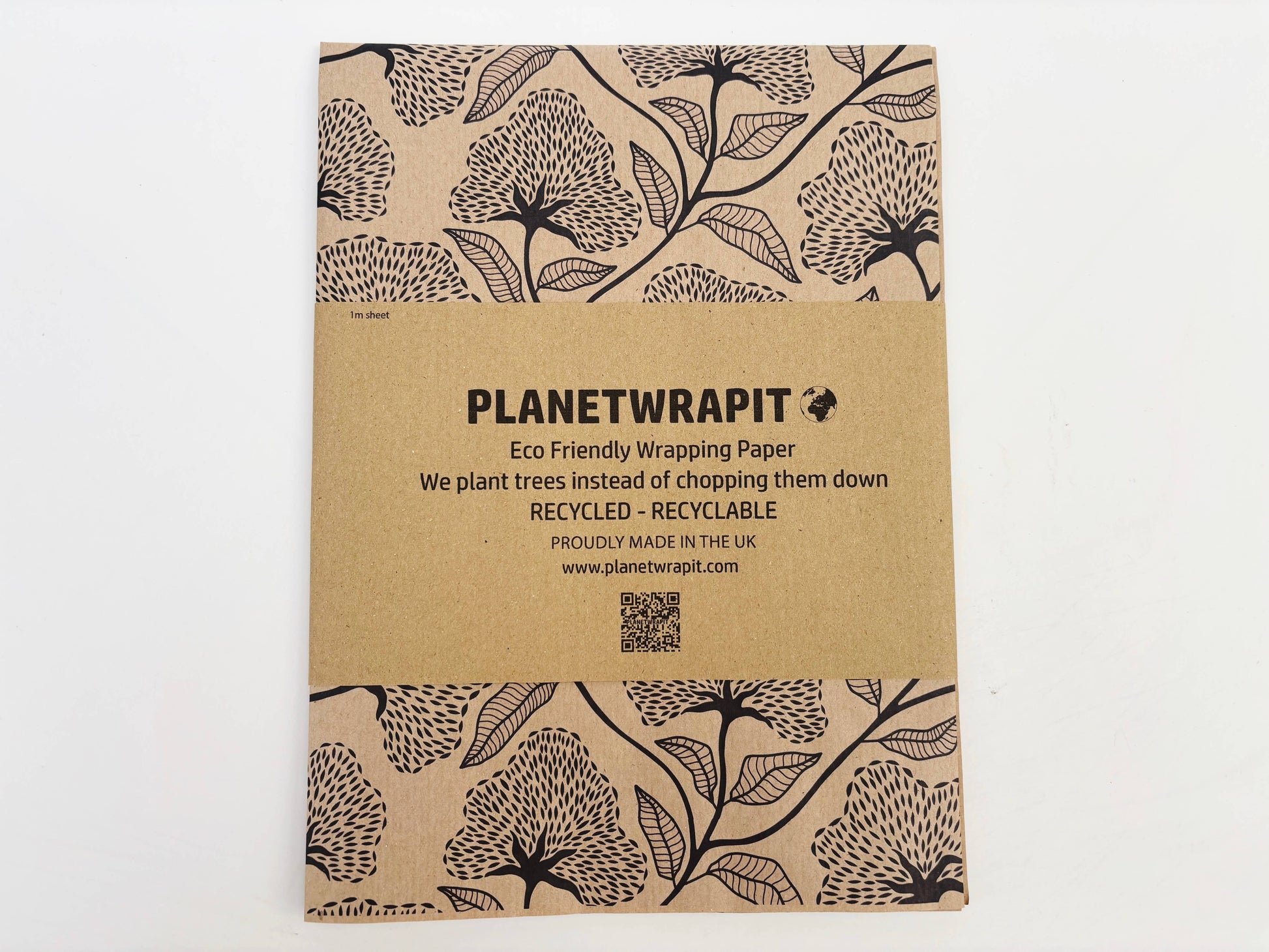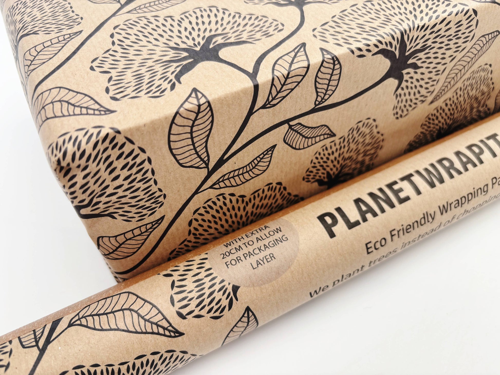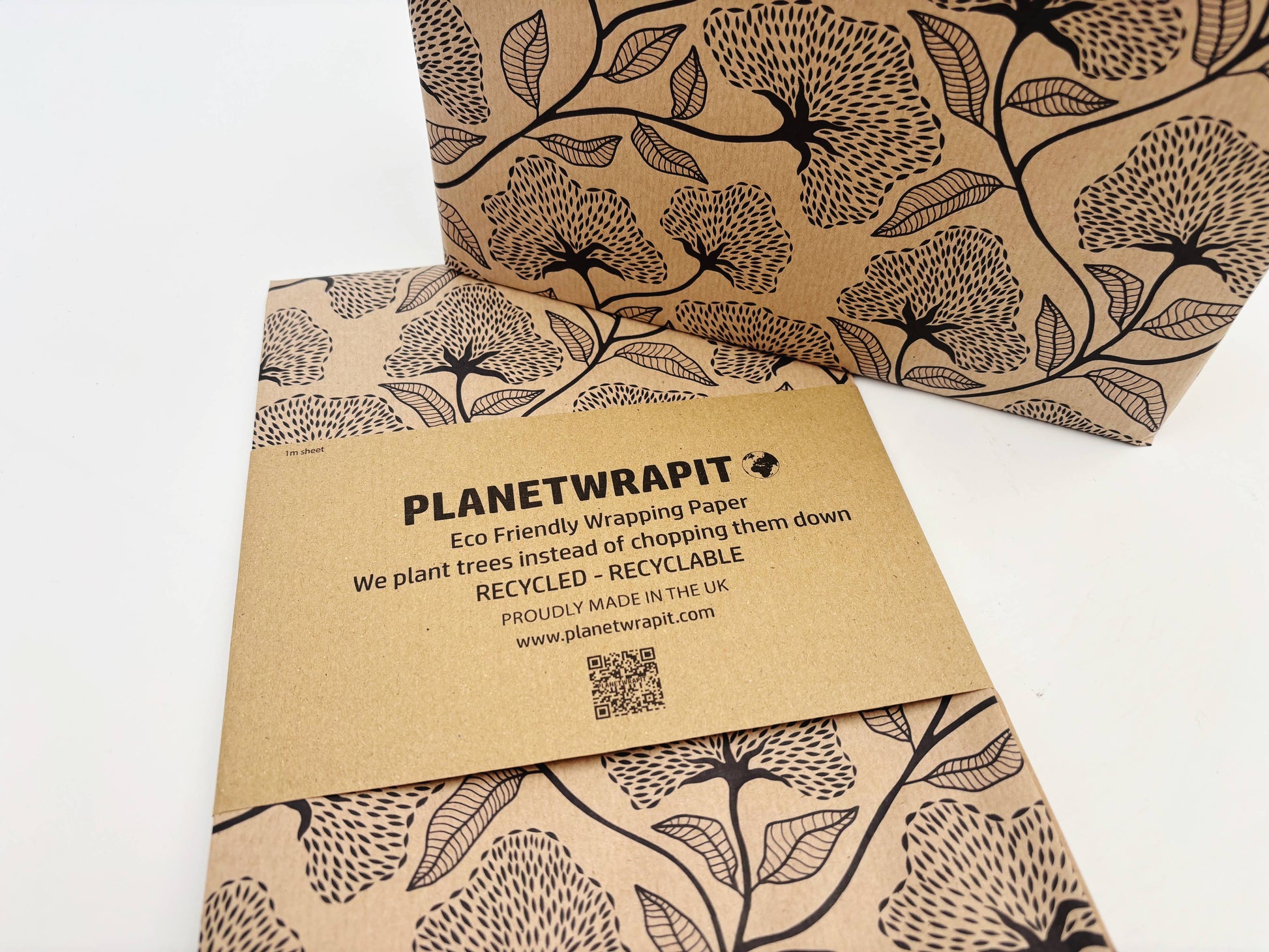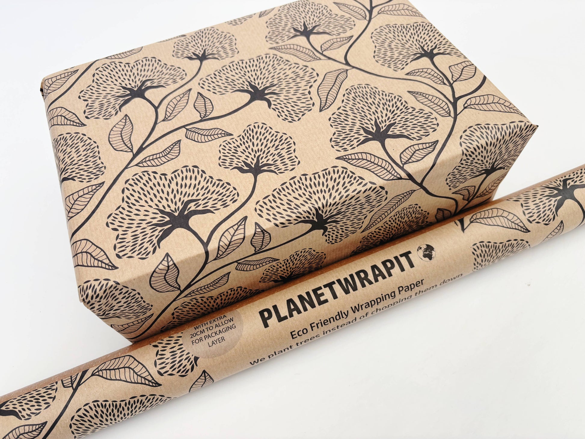 A sophisticated black floral print on our natural, recycled kraft wrapping paper.