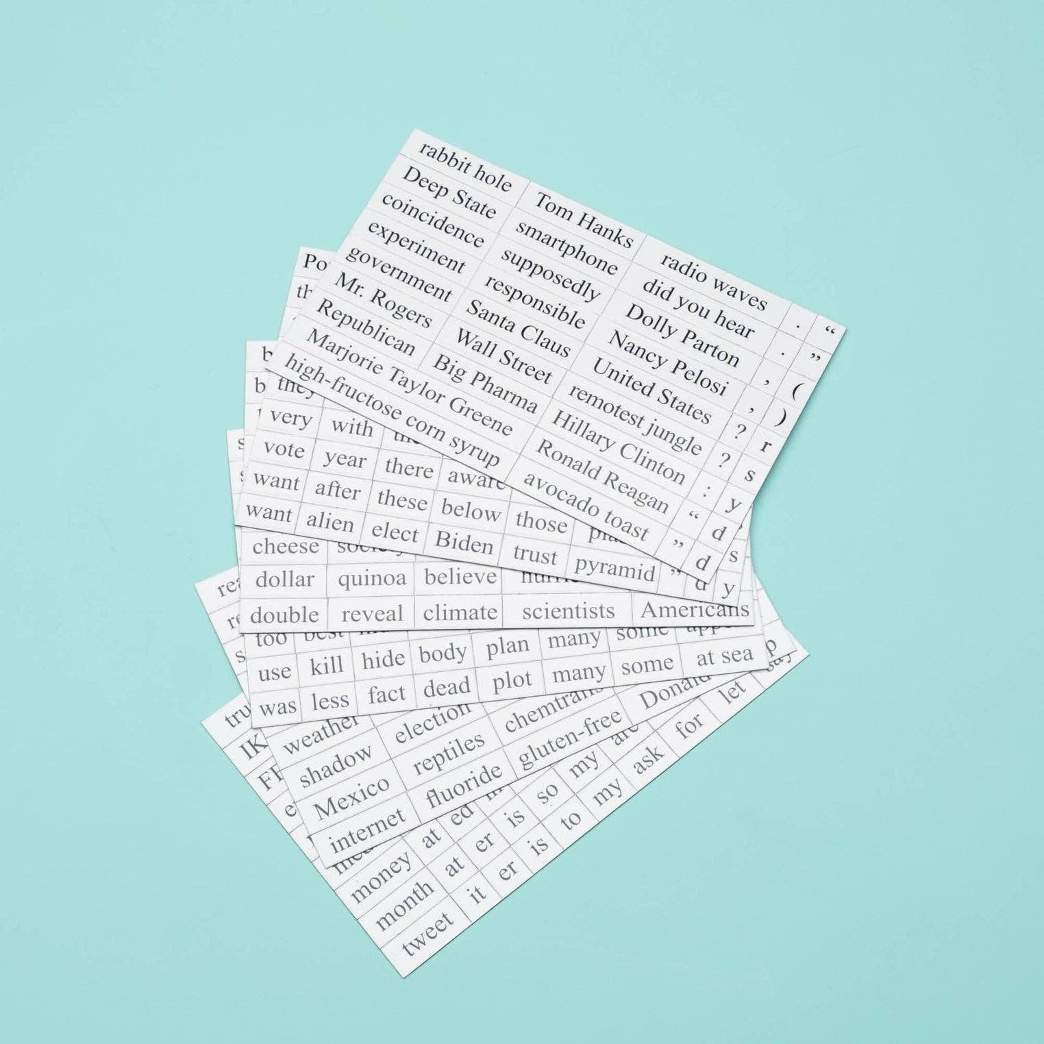 Our new Build Your Own Conspiracy Theory Kit includes over 350 totally reliable words and phrases that you can piece together to prep for Fox News appearances or entertain your friends. Just scramble the tiles and blame your failures on the dark underworld that controls the Academy of Motion Pictures or find fun new topics to discuss with your uncle who watches Tucker Carlson.