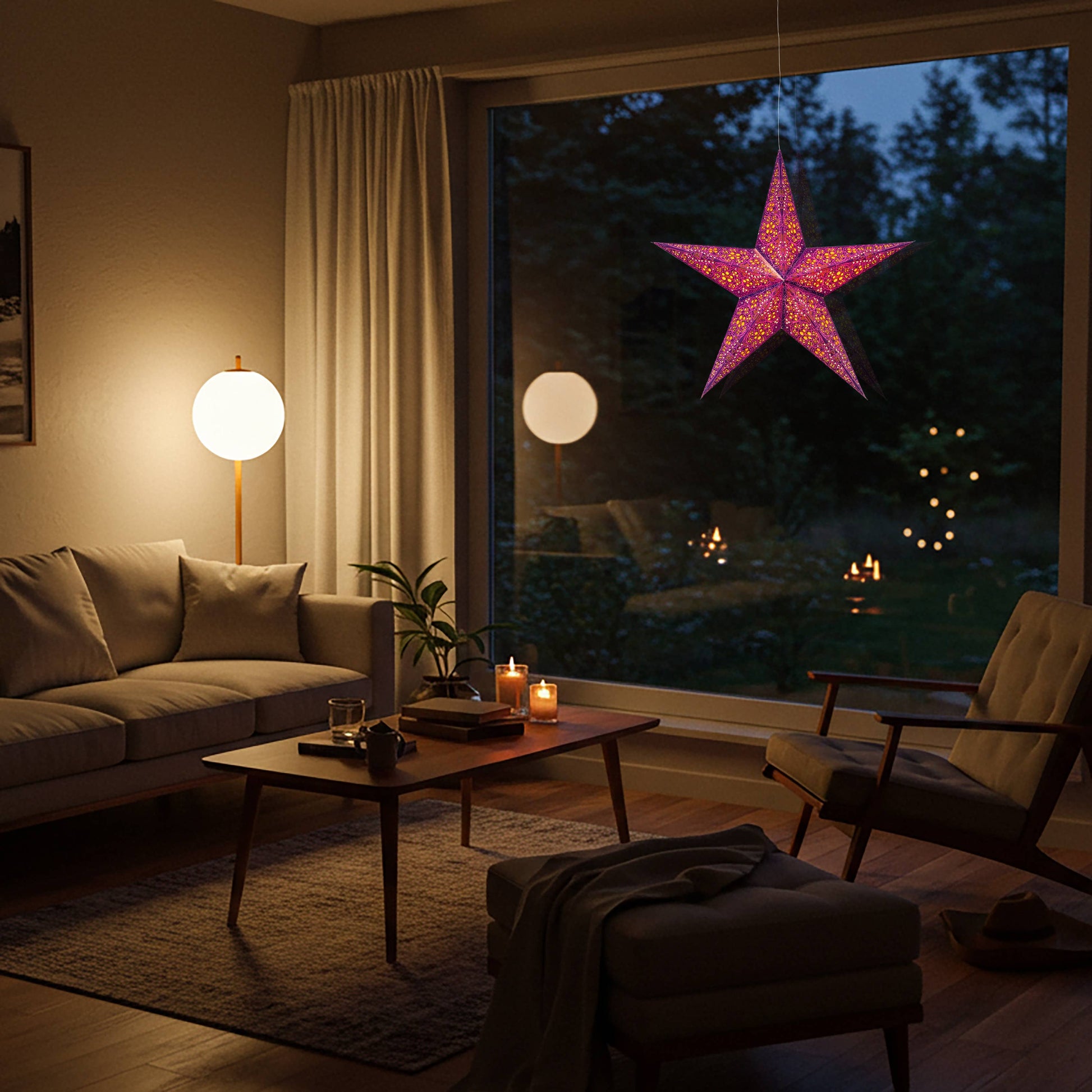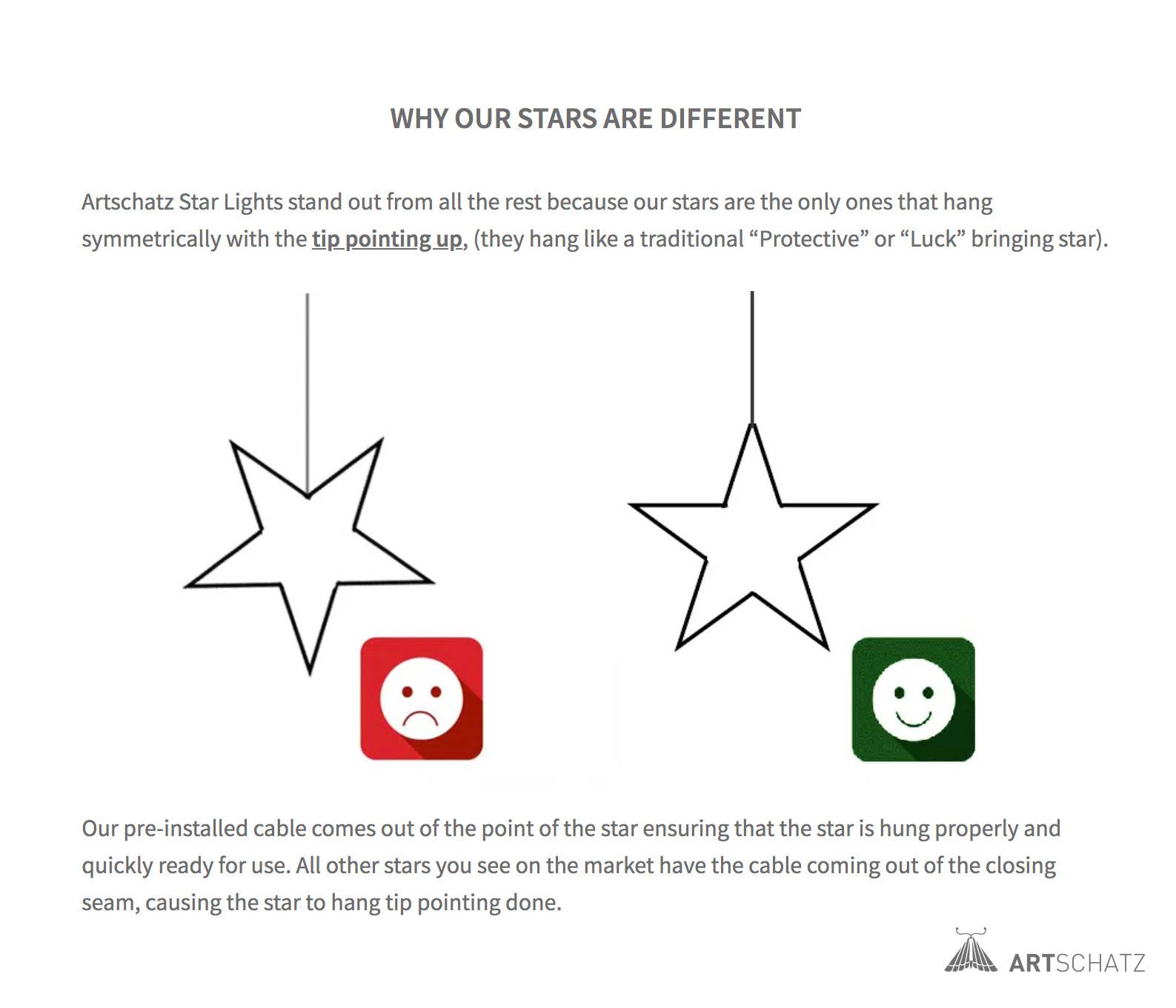 Unlike most paper stars, Artschatz Stars hang symmetrically with the tip pointing upward—reflecting the traditional symbol of protection and luck. The pre-installed clear cable exits through the top point for proper orientation and fast setup, you will find that others hang awkwardly from a side seam.