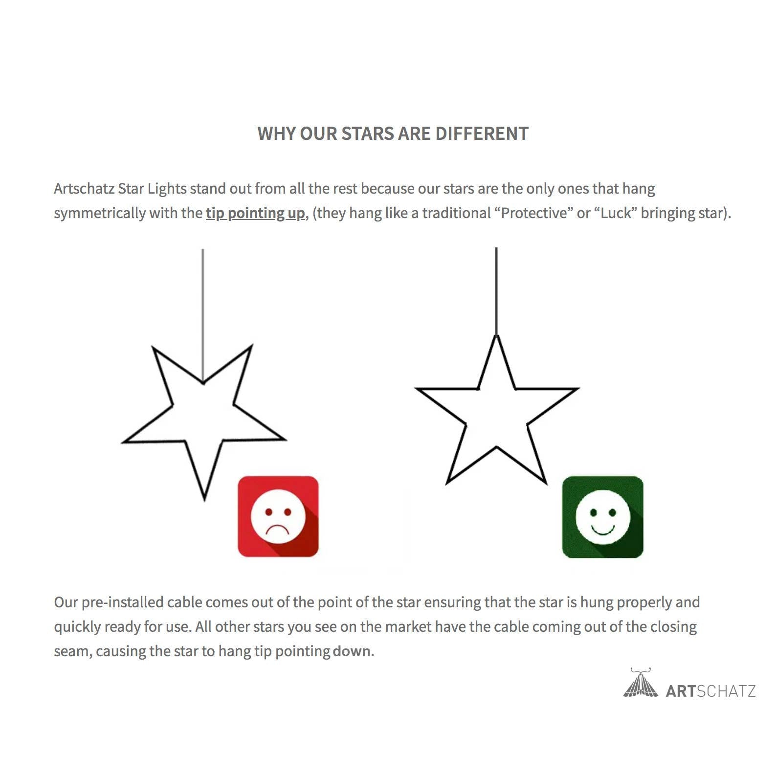 Unlike most paper stars, Artschatz Stars hang symmetrically with the tip pointing upward—reflecting the traditional symbol of protection and luck. The pre-installed clear cable exits through the top point for proper orientation and fast setup, you will find that others hang awkwardly from a side seam.