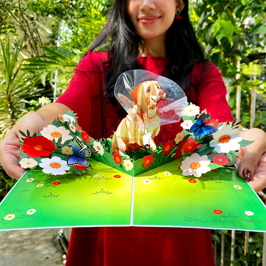 The front of this uplifting get-well card features an adorably optimistic Labrador (inspired by our very own troublemaker Butters!) sporting the dreaded cone of shame with the message: “Well, at least you don’t have to wear a cone – Get Well Soon.” Open it up, and this determined pup pops to life rocking the cone of shame, his bandaged paw raised like a true warrior. But don’t worry - he’s surrounded by a lush garden of flowers and butterflies, proving that even in the toughest moments, there’s beauty (and belly rubs) ahead.