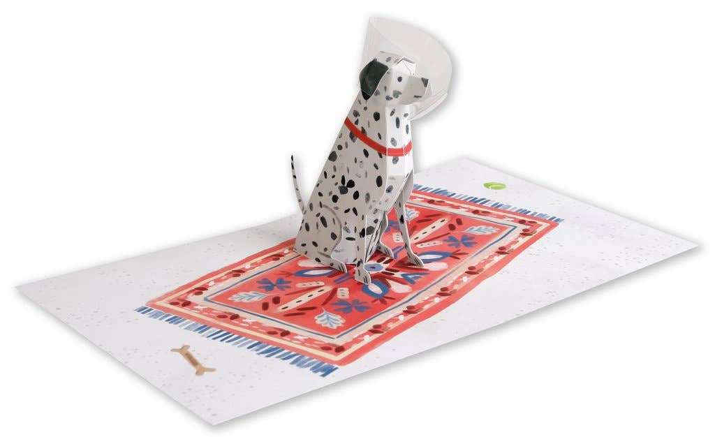 Send a dalmatian wearing an acetate cone for an expedited recovery in this paper-engineered pop-up greeting card.