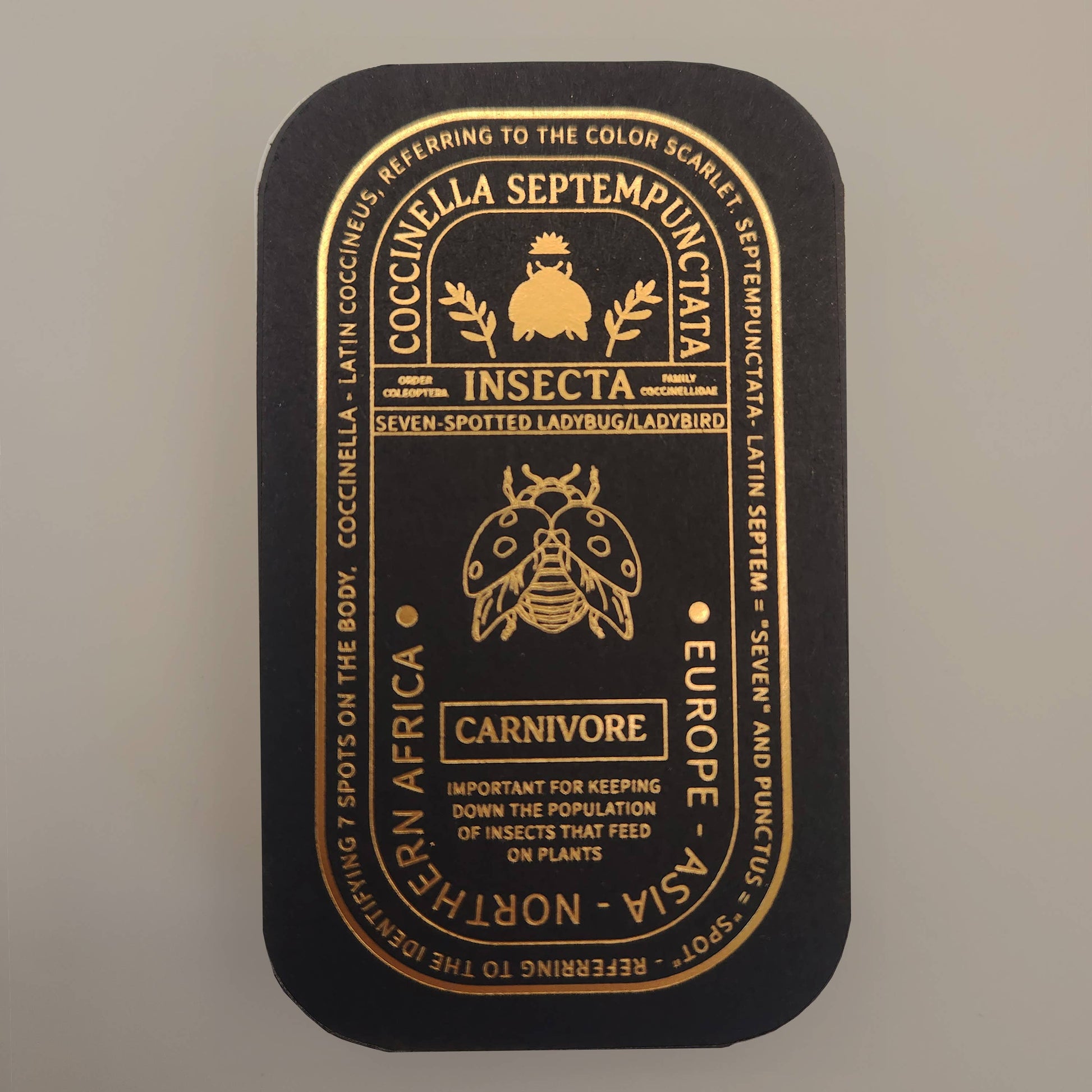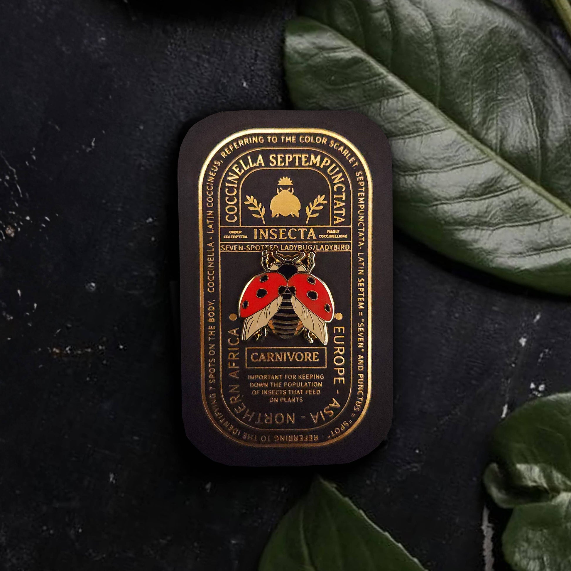 š Educational: The pin comes displayed on a striking black card adorned with gold foil detailing. You'll find a wealth of educational information about the Seven-Spotted Ladybug.
