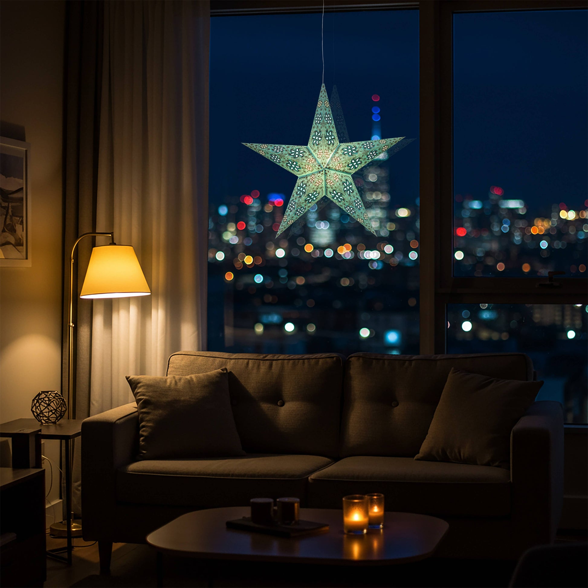 Unlike most paper stars, Artschatz Stars hang symmetrically with the tip pointing upward—reflecting the traditional symbol of protection and luck. The pre-installed clear cable exits through the top point for proper orientation and fast setup, you will find that others hang awkwardly from a side seam.