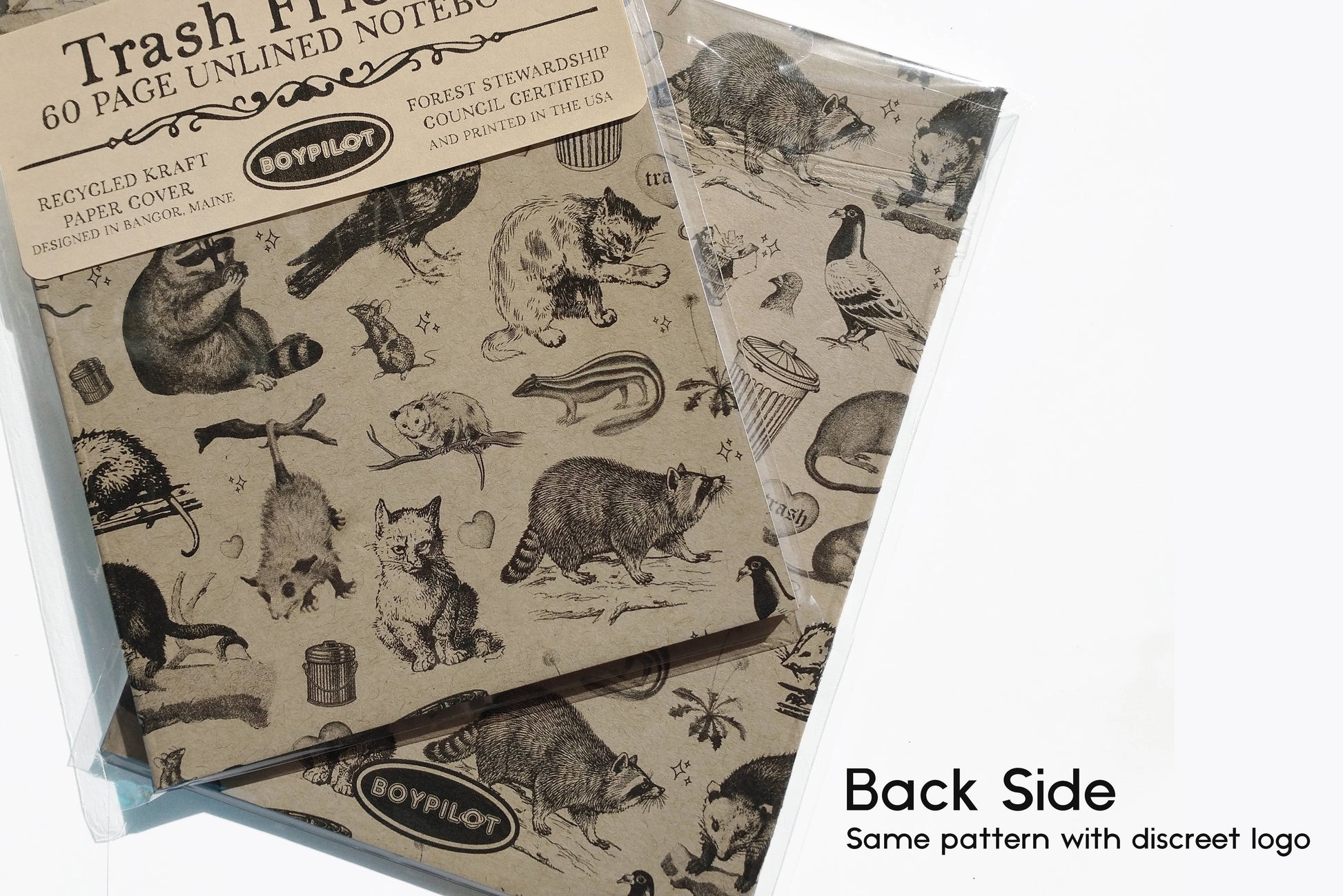This beautiful sustainable 5 x 7" unlined notebook has a kraft cover featuring charming vintage-style trash friend illustrations. Packed in Individual cello sleeve with info sticker.