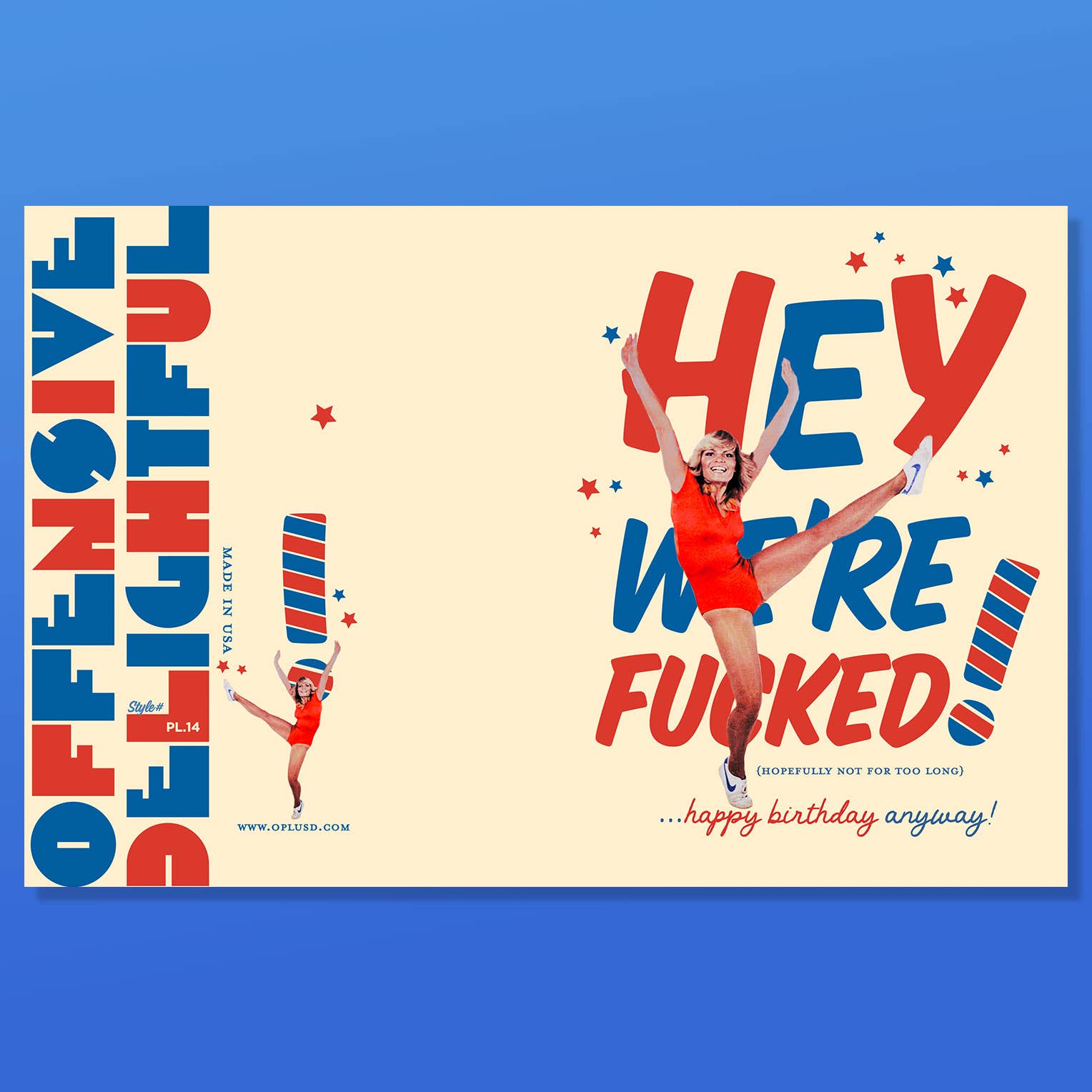 "Hey! we're fucked, (hopefully not for too long!) Happy Birthday anyway!" Style No. PL14 For those of us who need this everyday to not die inside. political card, America, red and blue, workout, girls, politics.