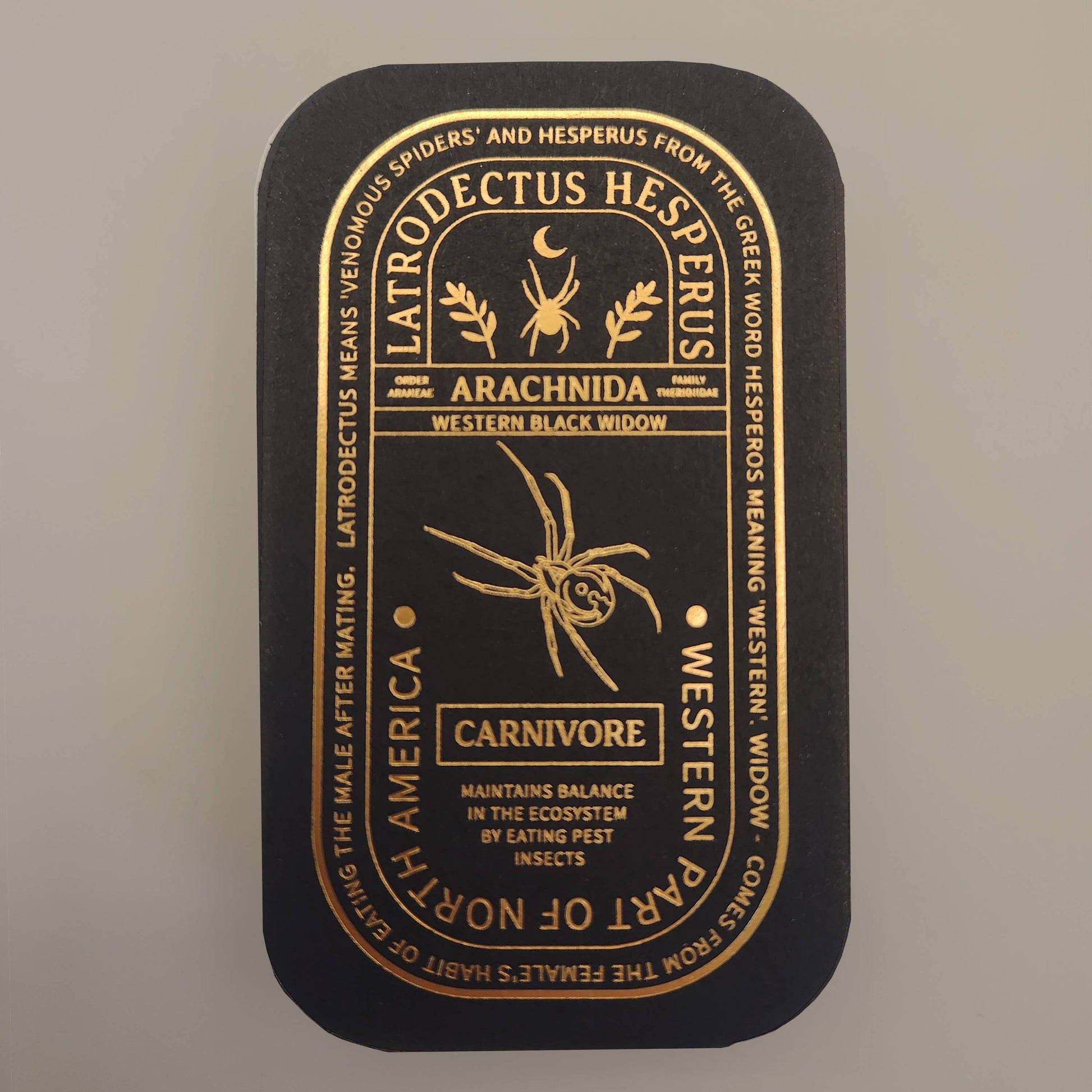 š Educational Fascination: Unravel the mysteries of the Western Black Widow with our black display card, adorned with gold foil details. Learn about its origin, taxonomic ranks, and its role in our ecosystem.